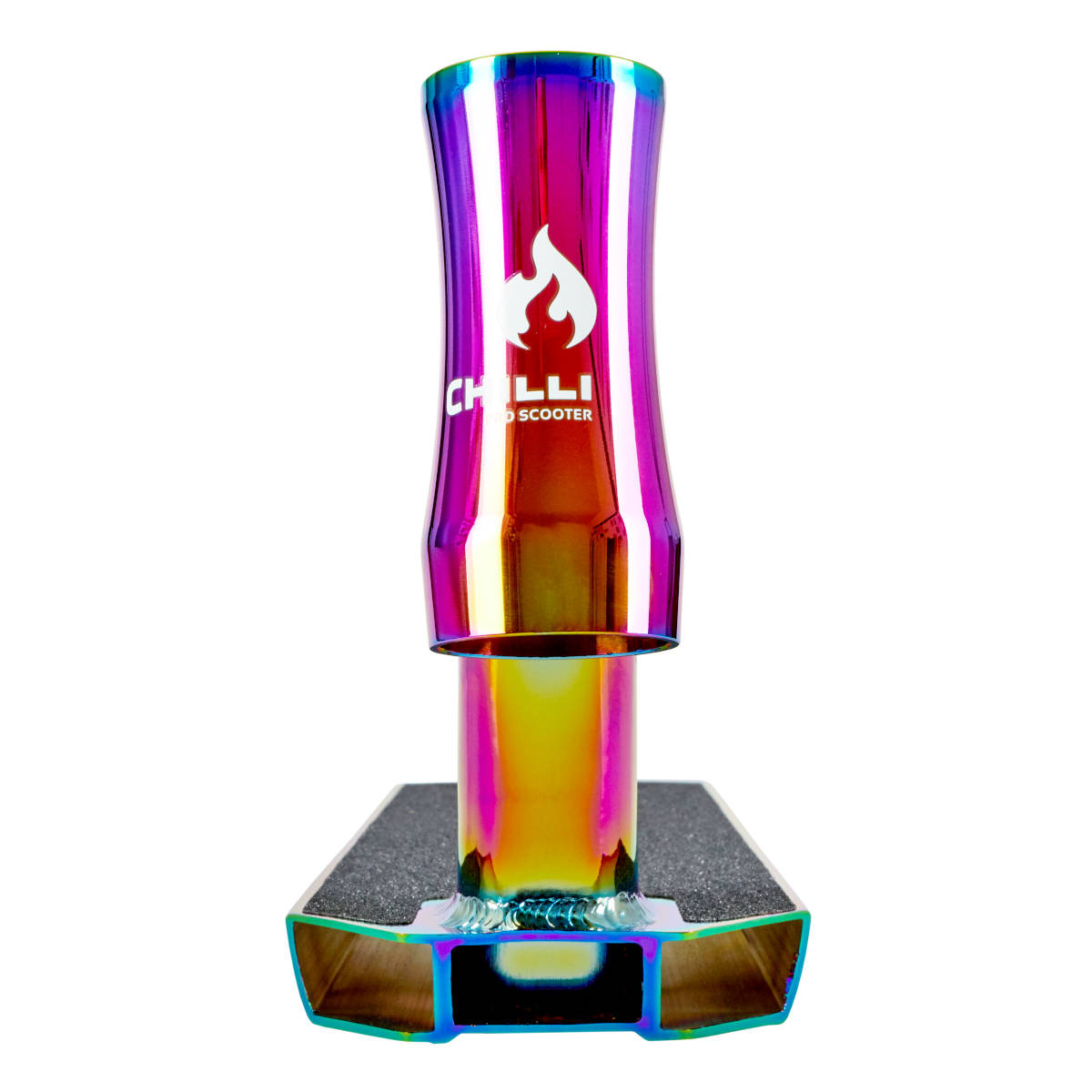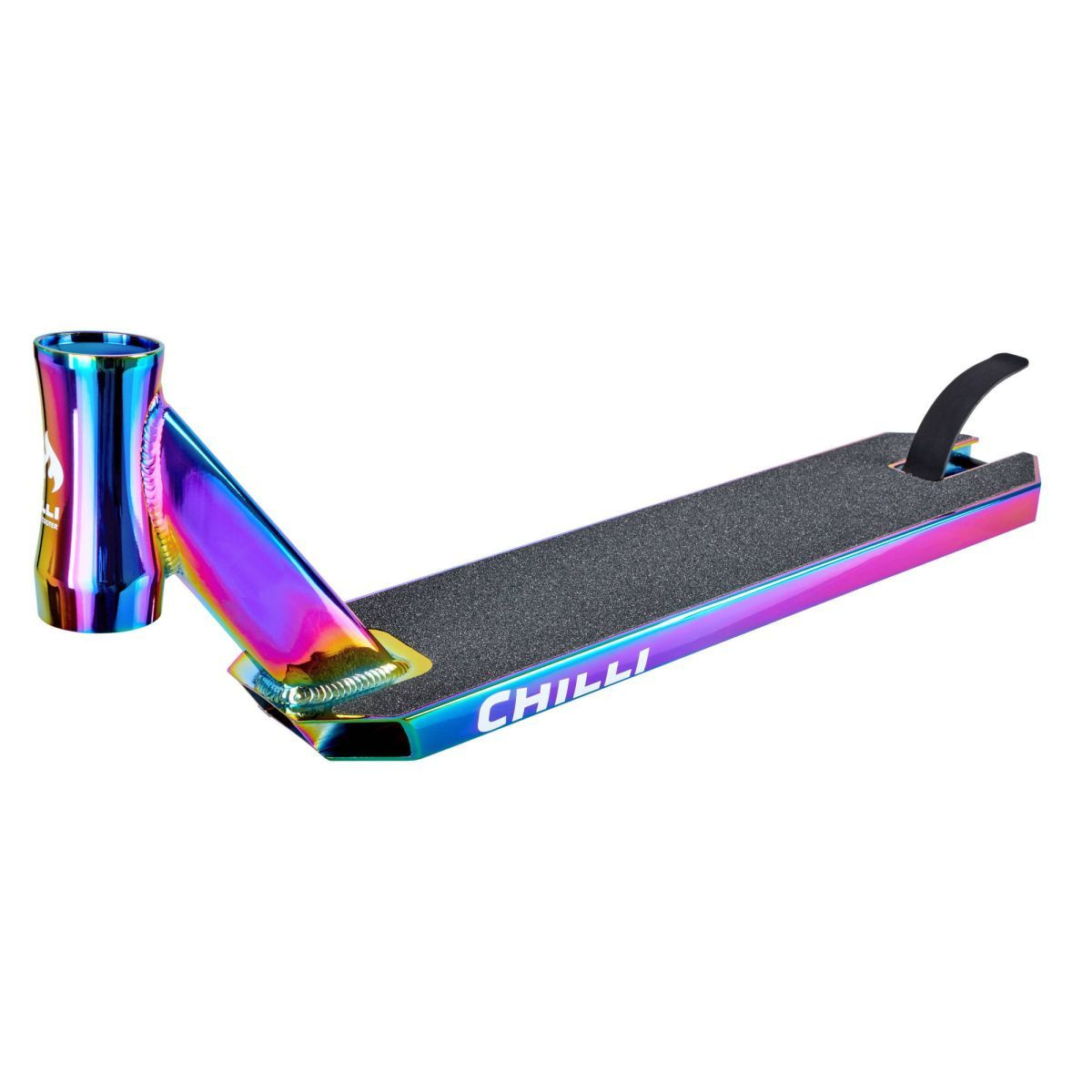 Recambio de estribo Reaper en diseño neocromo, diseñado para scooters freestyle. La placa de rodadura tiene pegada la lija original. El tablero incluye un freno trasero y un eje trasero con dos espaciadores. Esta placa está montada en el modelo Chilli Reaper Reloaded Neochrome.