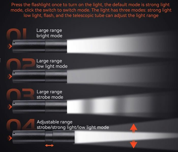 Weight: 121.5gWith Foldable Landing GearRising height: 5cmLED Chip: XPEWith 3 Flashing ModesBattery Capacity: 1200mAhCharging Time: About 2 hoursWorking Time after Recharging: 200-300 minutesMax. Range: 100 meters