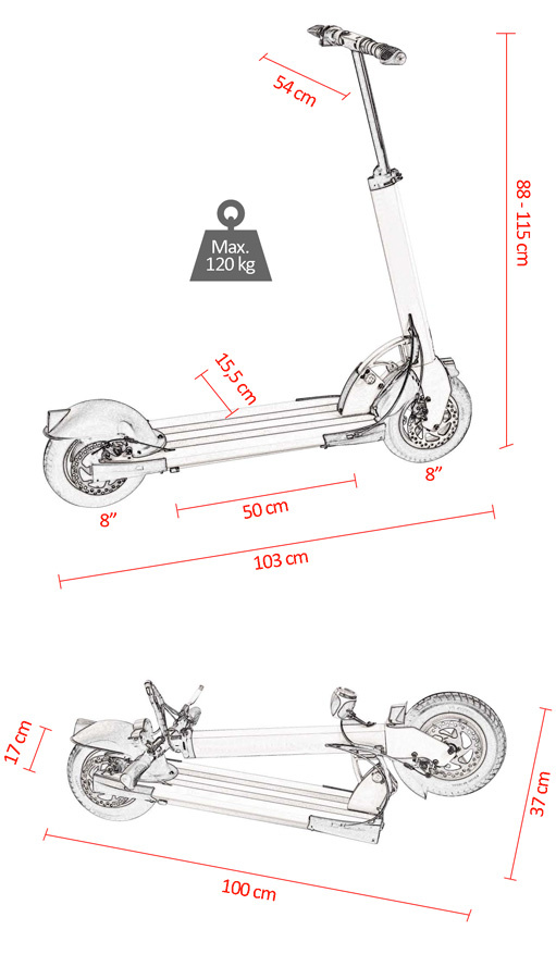 Dimensiones del scooter desplegado: 103 x 554 x 115 cm.
