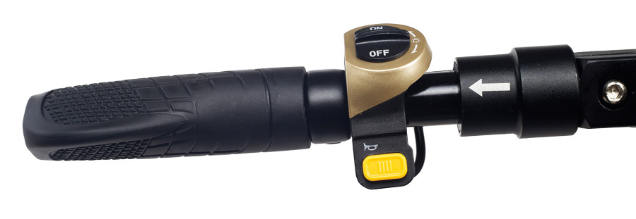 Para encender las luces delanteras y traseras alimentadas por la batería central, encienda el manillar, donde se encuentra el botón de la bocina . Además, la luz de freno trasero se enciende durante el frenado.