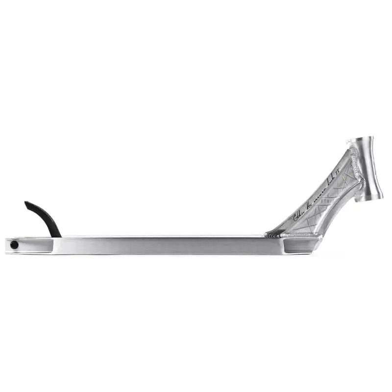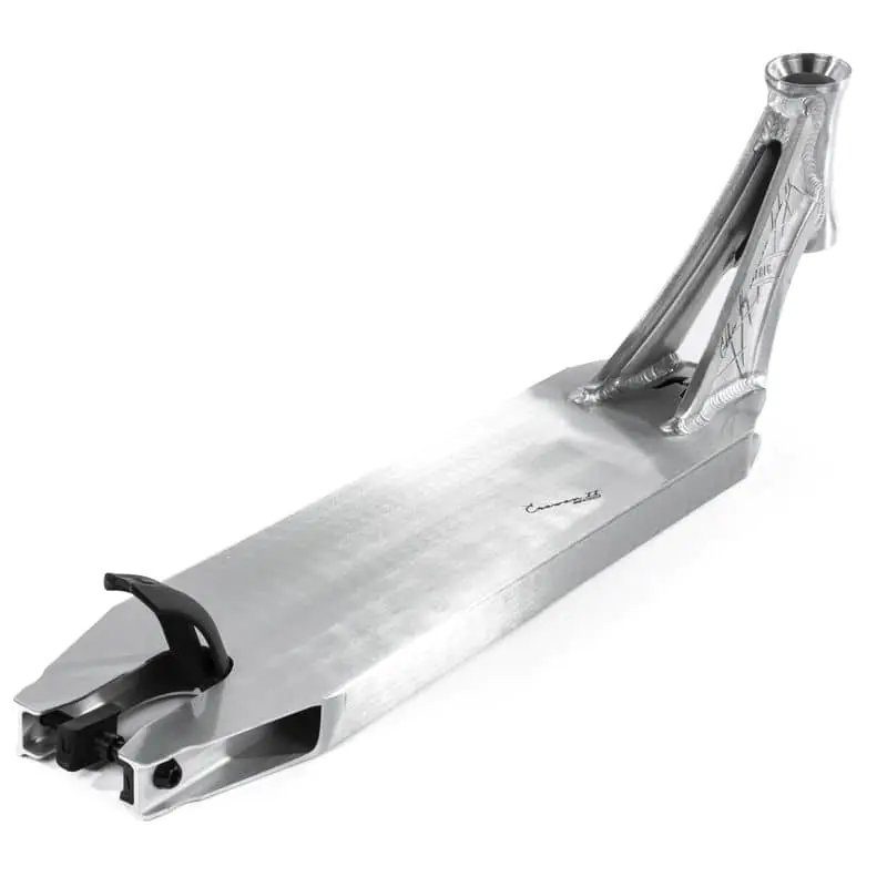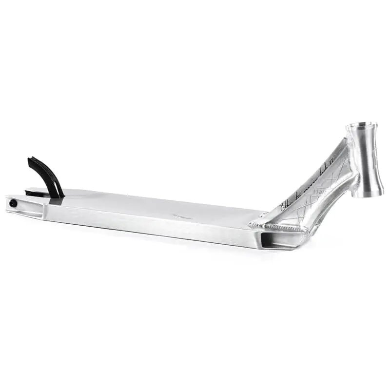 El peso de la placa Ethic Erawan V2 es una tontería, ¡ solo son 1260 gramos! Este peso se consigue gracias a que el tablero está fabricado en aluminio de alta calidad y al mismo tiempo ligero . El tablero mide 500 mm de largo , 120 mm de ancho y 325 mm de espacio para los pies . El cuello de la placa está soldado en dos partes y está hecho para un conjunto de cabezal integrado . La tabla tiene una concavidad , por lo que tus piernas simplemente no salen de ella. En el tablero se pueden montar ruedas con unas dimensiones máximas de 120x24 mm. Al final de la placa hay un freno de guardabarros flexible sin resorte hecho de plástico de alta calidad.