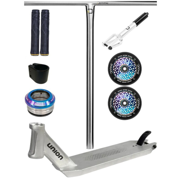 Tento custom jsme postavili tak, aby splňoval nároky jezdců, kteří hledají spolehlivý a lehký parkový setup. Základem je odlehčená deska Union Honeycomb, která je známá svou pevností a čistým designem. O rychlost a plynulou jízdu se starají kolečka Divine Light Core 110 mm spolu s přesnou IHC vidlicí Divine a hladkým chodem headsetu Divine Backflip. Ocelová T-řídítka Divine Standard pak dávají koloběžce stabilitu a kontrolu i při náročnějších tricích.
