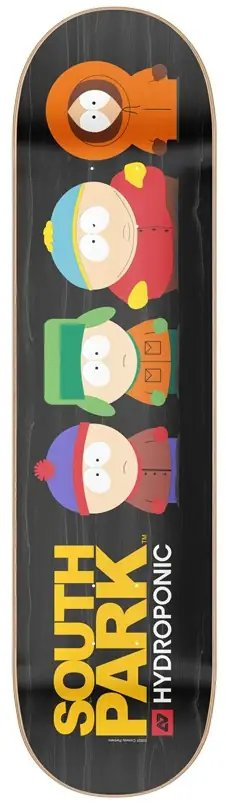 South Park de Hydroponic es una potente tabla de skate, fabricada con madera de arce hard rock de 7 capas y arce canadiense y resina epoxi. La tabla hecha de madera de arce de roca dura "patea" bien en el truco y tiene una larga vida.