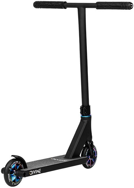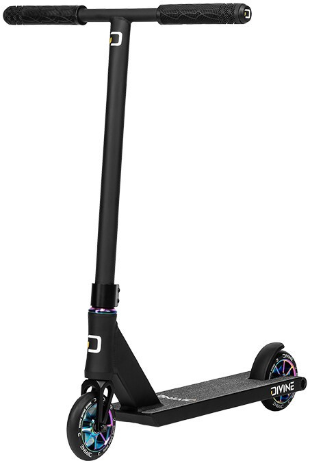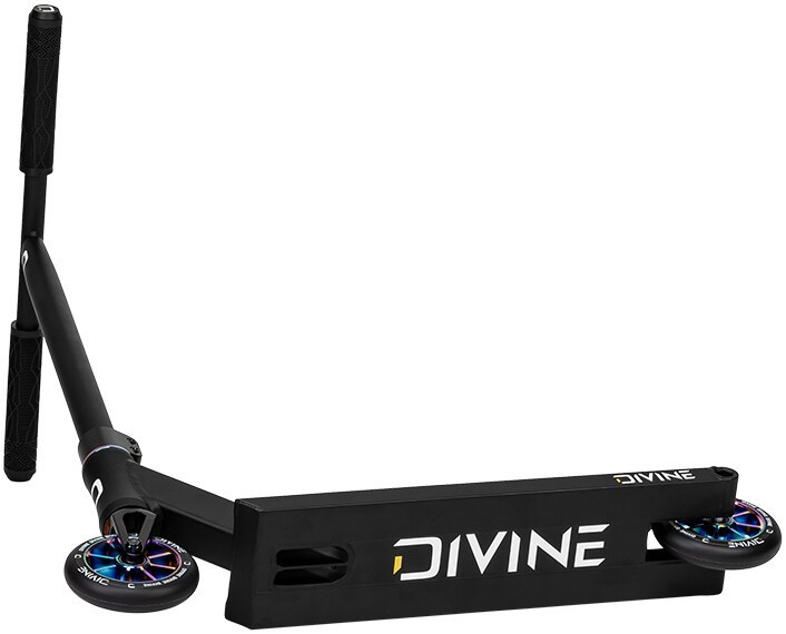 Divine Nyx XS es una versión más pequeña del scooter de calle. Este scooter de estilo libre está diseñado para niños pequeños de hasta 130 cm de altura que quieran divertirse tanto en el skatepark como en la calle. Todo el scooter pesa sólo 3,2 kg, lo que facilita su manejo. El scooter está equipado con un manillar de acero en forma de T con empuñaduras blandas. El manillar está sujeto por una abrazadera de dos tornillos que, junto con el sistema de compresión IHC y la horquilla de aluminio de una sola pieza, mantiene unido el scooter y garantiza una marcha silenciosa. El scooter gira de maravilla gracias a los rodamientos industriales montados en el cuello de la tabla. La tabla es genial con sus dimensiones, footspac, extremo cuadrado de la tabla y freno de pie de plástico. El scooter está equipado con un par de ruedas de 110 mm con centros de aluminio.