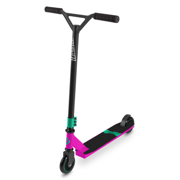 Los principiantes pueden probar sus primeros saltos y trucos en este scooter atractivo y asequible. La construcción se caracteriza por manillar soldado BMX, horquilla de acero, placa de aluminio soldada reforzada y abrazadera de tres puntos.