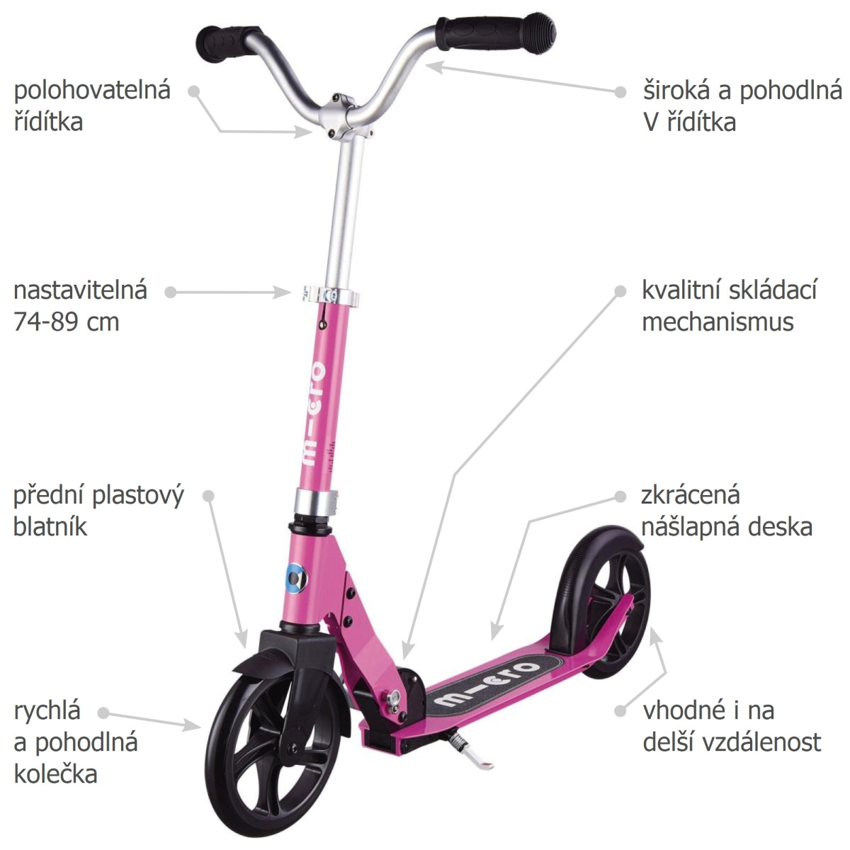 Micro Cruiser Pink es un scooter plegable para niños en color rosa, adecuado para distancias más largas. Es uno de los scooters plegables para niños más cómodos.