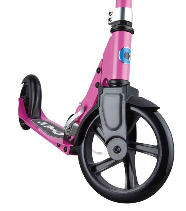 La ventaja de este scooter son las ruedas de PU de 200 mm rápidas y cómodas, que también se montan en scooters para adultos. La ventaja de las ruedas de 200 mm sobre 120 mm o 100 mm es que las ruedas más grandes superan mejor las superficies irregulares de la carretera . La desventaja de las ruedas grandes es la peor capacidad de plegado del scooter plegado y el mayor radio de giro.