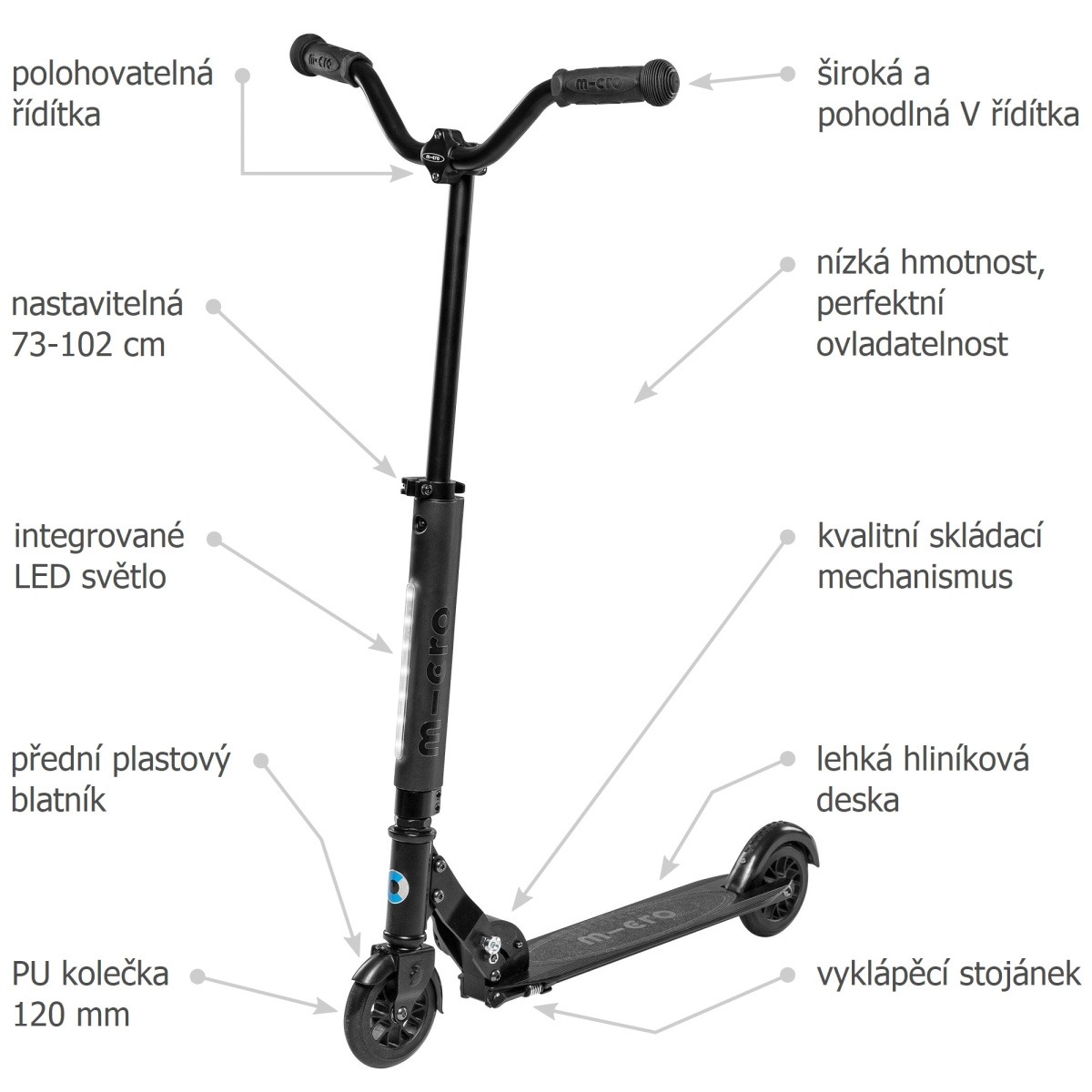 Sprite Deluxe Black es una versión mejorada de los mundialmente famosos y probados scooters de aluminio Micro Sprite. El scooter tiene un diseño negro distintivo y atractivo, que atrae tanto al adolescente como al junior. Al igual que el modelo anterior, Sprite Deluxe está clasificado entre los scooters para niños. Aunque tiene una capacidad de carga de 100 kg, está destinado principalmente a niños, jóvenes y jóvenes.