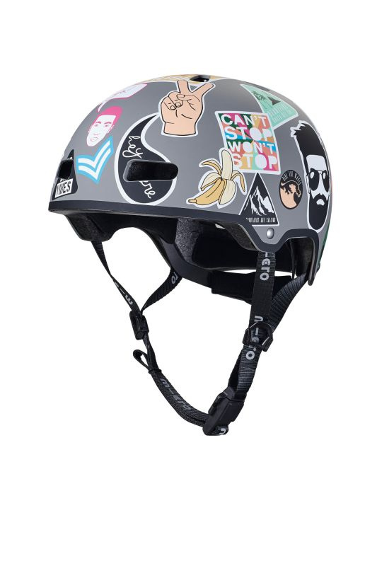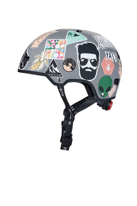 Micro casco de seguridad de tamaño ajustable con rueda de sujeción. Este es un casco con un diseño de pegatina. El casco es adecuado para andar en scooter, gorila para niños, patines y patineta. Acolchado adicional dentro del casco para mayor comodidad y seguridad. 8 orificios de ventilación aseguran una buena ventilación de la cabeza. El innovador sistema de sujeción magnética aumenta significativamente la seguridad y simplifica la sujeción de la correa debajo de la barbilla.