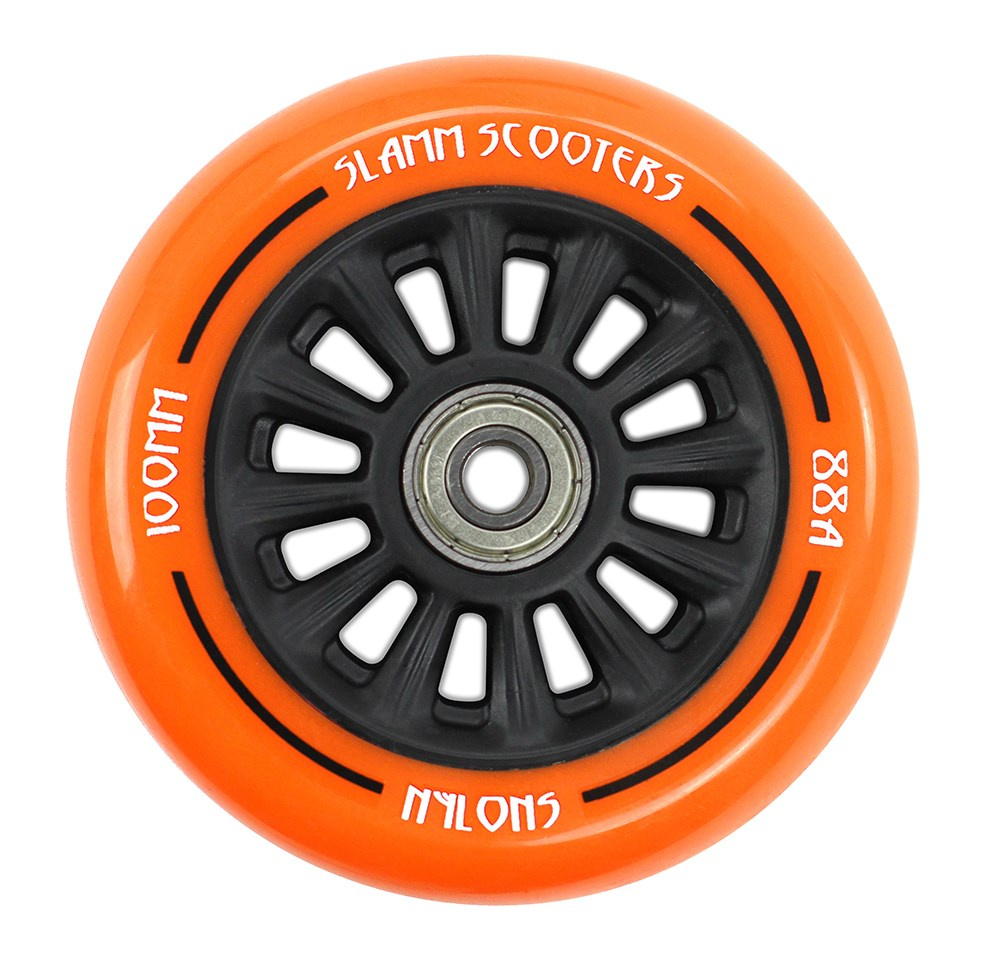 Rueda de la marca inglesa Slamm , medida 100 mm . El peso de la rueda es de 160 gramos gracias al centro de plástico . La rueda está destinada principalmente a principiantes .